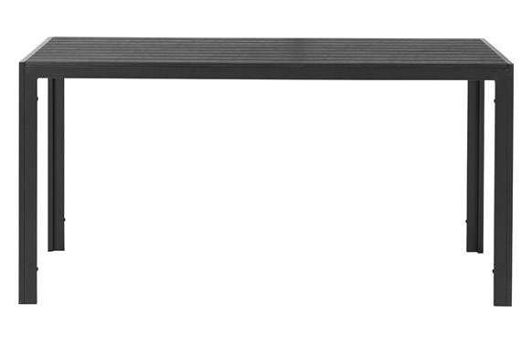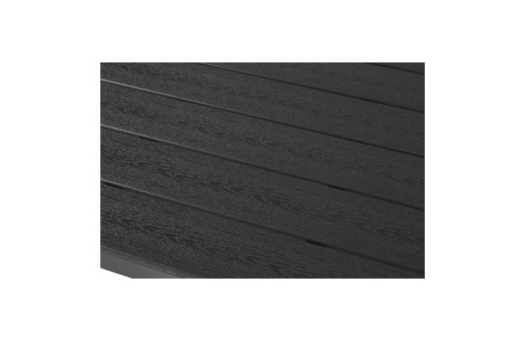 Estructura de aluminio color negro con sobre en lamas de polywood color negro. 90 x 150 x h74cm. Polywood es una madera sintética que se fabrica con plástico y parece madera.