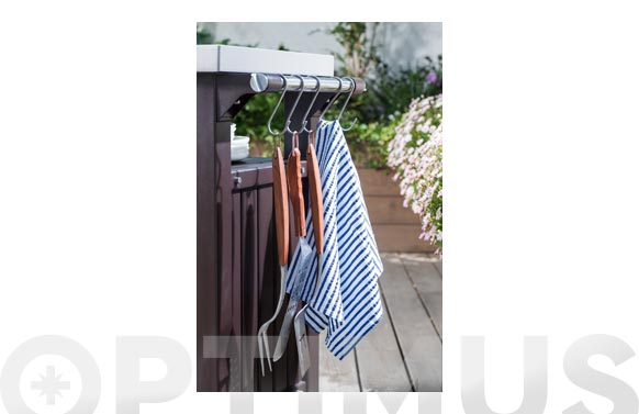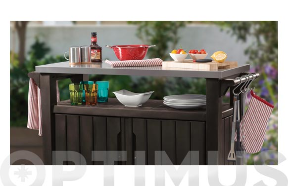 MESA AUXILIAR BARBACOA RESINA MARRON. Ext. 123.7x54x90cm. Mueble accesorio ideal para barbacoas. Parte superior de gran dureza para poder cocinar y trabajar con seguridad. Incluye dos ruedas. Fabricado en PVC de gran resistencia, preparado para todos los climas. No necesita mantenimiento. Mesa/carro auxiliar para la cocina, barbacoa o terraza (o mueble bar). Fabricado en resina. Modelo Unity XL ideal para barbacoasgrandes. Medidas exteriores: Ancho 124 Fondo 54 x Alto 90 cm Medidas embalaje: Ancho 117,6 Fondo 65,7 x Alto 38 cm Color marrón. Encimera de trabajo fabricada en acero inoxidable 304, resistente, estable ymuy fácil de limpiar (garantía de máxima higiene). Tratamiento UV, nocambia de color con el paso del tiempo. Montaje rápida, prácticamentesin herramientas adicionales. No mantenimiento requerido. Incluye 2 ruedas en un lateral para facilitar su transporte y una asa ancha en elotro lateral. El armario incluye un práctico estante de uso múltiplepara almacenar accesorios de barbacoa.