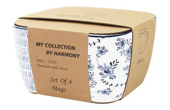 Set 4 tazas, porcelana, surtido decorado color azul, capacidad 340 ml, apto para lavavajillas y microondas.