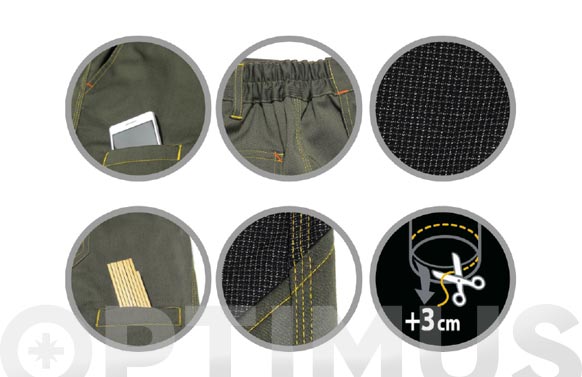 Pantalón técnico con inserciones en tejido antiabrasión y reflectantes. Posibilidad de regulación en longitud y cintura. El tejido elásticopermite tanto la comodidad como una imagen propia de los mejores pantalones del mundo deportivo. Dispone de 9 bolsillos, entre los cuales uno porta móvil y otro porta metro. Triples costuras y un tejido particularmente resistente garantizan una alta resistencia durante los trabajos más duros. Composición: 65% poliéster, 32% algodón, 3% spandex. 260g/m2.