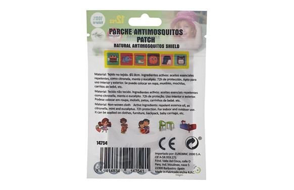 Parches antimosquitos de aceite de citronela. No toxico. Duración 72 horas. Medidas 2,8mcm. No contiene compuestos de floruro. Protege en actividades en el exterior e interior. Area d eproteccin 1 metro alrededor del parche. El expositor se compone de 2 tiras de 25 bolsas. (Cada bolsa contiene 12 parches)