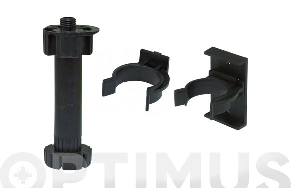 Kit compuesto por 4 patas de plástico y 8 soportes (4 para madera y 4para aluminio) con regulación y con espiga. Para zócalos de cocina.