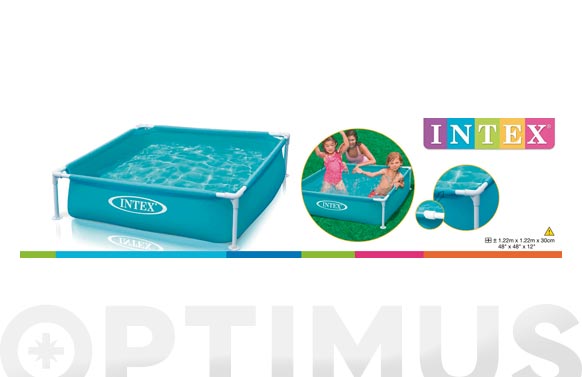 Piscina desmontable tubular Intex. Con forma cuadrada y de la línea Mini Small Frame, tiene capacidad para 337 litros de agua. Fabricada devinilo y con estructura metálica color azul. Medidas: 122×30 cm. pensada para ser utilizada por 1 o 2 niños a partir de 2 años de edad. Su estructura tubular compuesta por piezas independientes de acero resistente y duradero, pintadas con epoxy que protege al metal contra el óxido.