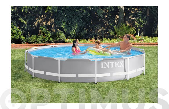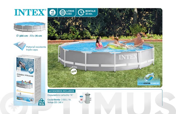 PISCINA REDONDA PRISMA METAL FRAME. Ø366CM X 76CM. Capacidad 6503 lt.Estructura tubular de acero muy resistente y tratado para evitar la corrosión u oxidación. Laminado PVC triple capa. Incluye bomba filtrante2.006 l/h y cartucho.