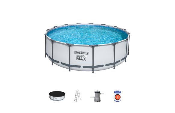 PISCINA STEEL PRO MAX Ø 457 X 122 CM. Con depuradora de cartucho 3.028Litros/Hora, Con Cubierta, Escalera, Capacidad 16.015 Litros.