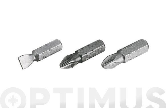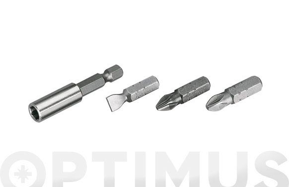 1 set de puntas. 5 ranura, 0,6 x 4,5 mm, 0,8 x 5,5 mm. 1 x 5,5 mm, 1,2x 6,5 mm, 1,6 x 8 mm. 3 Phillips PH 1 – PH 2 – PH 3. 3 Pozidriv PZ 1- PZ 2 – PZ 3. 1 portapunta, magnético. Longitud 25 mm.
