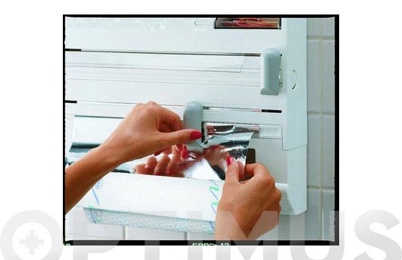 26 X 38 X 6.5 CM. Portarrollos para 3 rollos. Dispone de 1 portarrollos superior con cortador específico para film, 1 portarrollos intermedio con cuchilla de rodillo para papel de aluminio y un portarrllos inferior para papel de cocina. Tornilleria incluida para su montaje en pared.