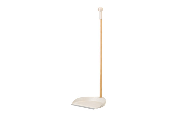 Recogedor con pinza sujetaescobas. con palo de bambú natural. tiene una regleta de goma en el extremo de la base para apurar al máximo. fabricado con bioplásticos bio-basados. (29x27x77)