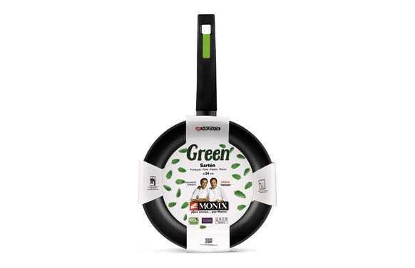 Recubimiento antiadherente de alta resistencia. Apta para todo tipo decocinas. Apta para lavavajillas. Sartén Green de aluminio forjado conantiadherente Xylan® de Witford (Bi-capa de alta calidad que está diseñado para superficies que requieren propiedades antiadherentes y están sometidas a abrasivos o de alto desgaste). Mango ergonómico de baquelita con acabado “soft-touch”.
