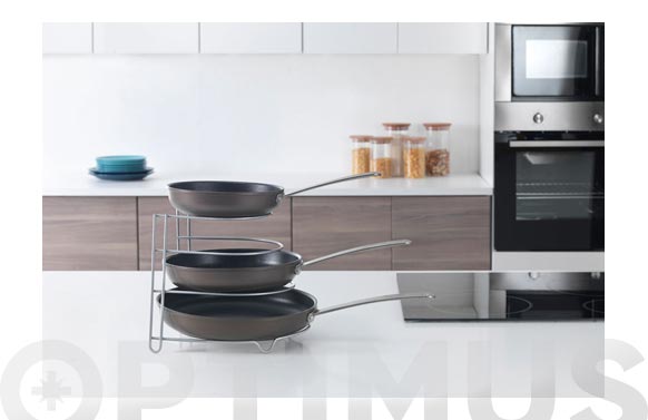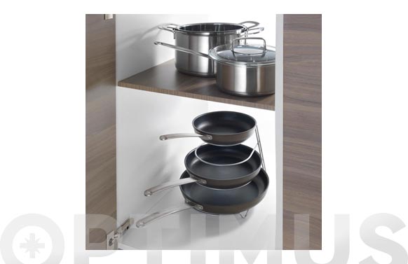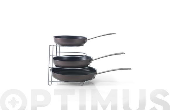 Sartenero 4 alturas. Sartenes ordenadas en 4 alturas y sin rayaduras. Capacidad 4 sartenes con distinto diametro. Recubrimiento polytherm. 26 x 47 x 30cm