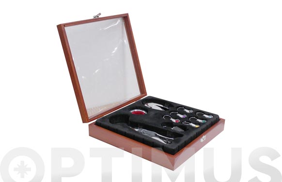 OPORTUNIDAD HASTA AGOTAR EXISTENCIAS. PVP ANTERIOR: 22.95€. En un elegante estuche de madera dispones de cortador de precinto, sacacorcho, antigotas y tapón. Además 6 identificadores de copa de diferente color.