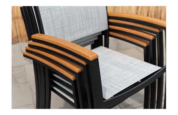 Aluminio color negro mate con textilene color gris, reposabrazos con acabado en madera tropical FSC. 57,65cm x 55,20cm x h 84.50cm. Peso Máx. 110 kg,