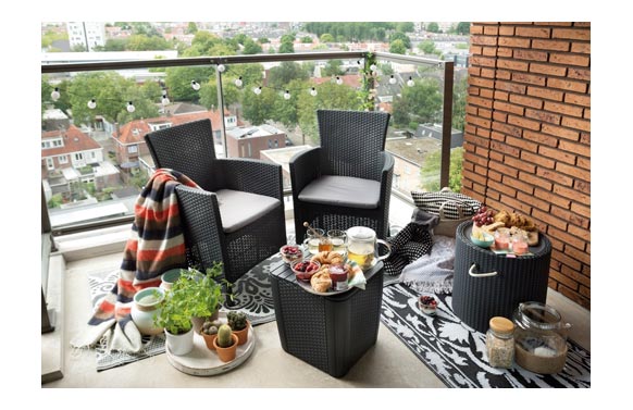 CONJUNTO IOWA. 2 SILLONES + 1 MESA CON TAPA. Estructura de ratán de resina color gris antracita, incluye cojines de color gris. Sillón 62 x60 x 89 cm, mesa con tapa 39 x 39 x 43 cm.