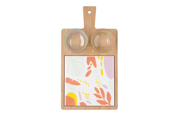 Tabla aperitivo bambú vidrio porcelana madera bamboo con mango 2 bols kaleido. sodo cerámica porcelana multicolor. 31x17x6cm (largo x ancho x alto).