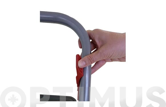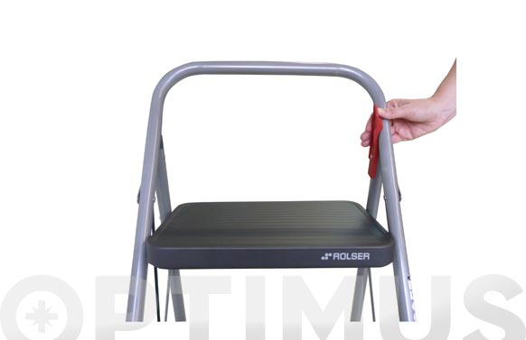 Taburete doméstico de 3 peldaños. Componentes: Seguro para evitar el plegado involuntario, amplia superficie de subida, tirantes-guía para facilitar la apertura, conteras y rellano antideslizantes. Resistenciade carga 150 kg. Altura máxima: 700 mm. (hasta la plataforma). Alturataburete abierto 990 mm. Plegado ocupa el mínimo espacio. Certificadopor AENOR según Norma Europea UNE EN-14183