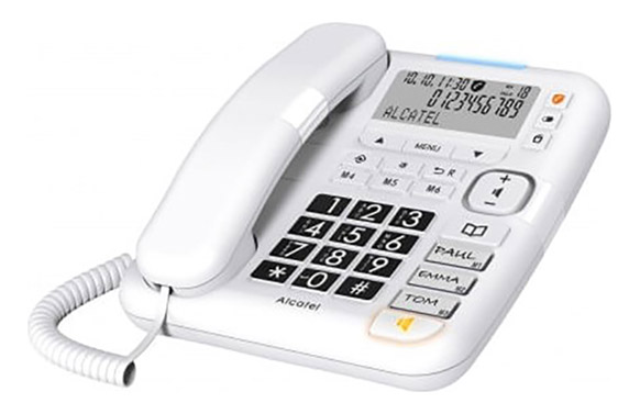 Teléfono con cable «seniors»- Bloqueo inteligente de llamadas con tecla dedicada- Gran pantalla con grandes caracteres – Grandes teclas -Tecla Audio Boost (30dB)- Timbre potente (80dB)- Manos libres- 6 teclas con memoria directa