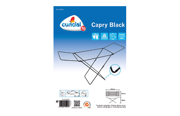El tendedero de pie Capry Black de Cuncial te sorprenderá por su excelente relación calidad precio. Su elegante diseño y su color oscuro te permitirán usarlo en cualquier lugar. La estructura es de varillas de acero. Gracias a sus 18 metros de tendido no tendrás problemas para colgar toda tu colada. Se pliega de manera fácil y ocupa poco espacio. Es apto para utilizar en bañera, también en cualquier otro lugar de la casa o en el exterior. Viene con tacos antideslizantes en el patas incorporado para que no tengas que preocuparte por su estabilidad.»