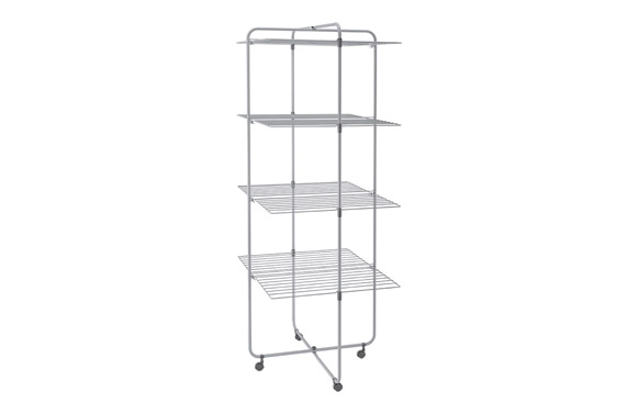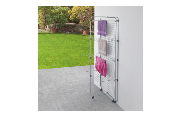 Tendedero torre. Plastificado con PDPE color gris. Rejillas abatibles. Plegable. Con sistema de media apertura. Con ruedas.Capacidad de tendido: 44 mt. Medidas: Largo 64 x 72 ancho x 167cm alto