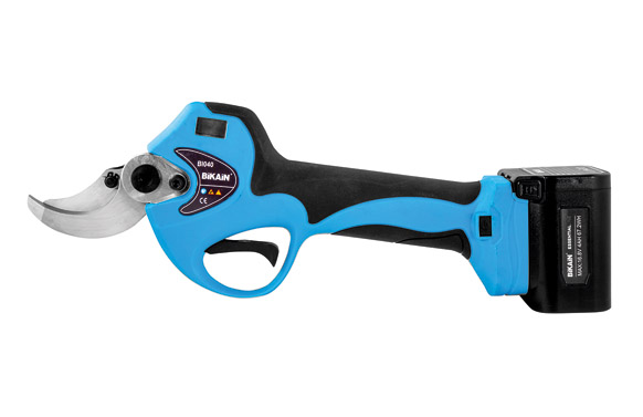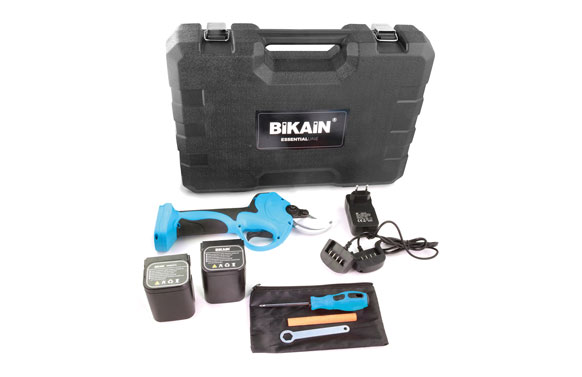 TIJERA DE PODA A BATERÍA BIKAIN. Potencia 16.8 V. Capacidad de corte hasta 25 mm. Funciona con 1 batería de 2,5 Ah. Incluye maletín, 2 baterías de 2.5 Ah y cargador de dos tomas.