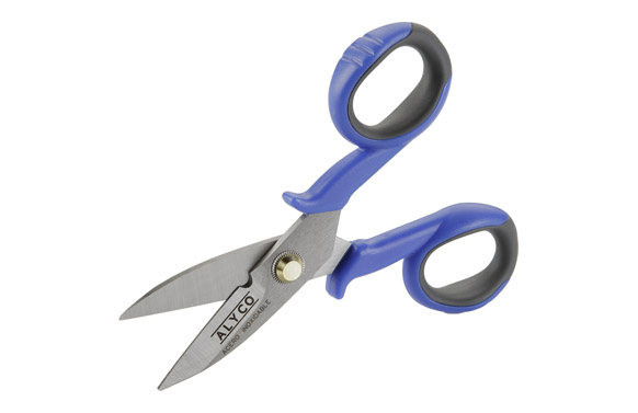 Tijera fabricada en acero inoxidable, filos de corte dentados (antideslizantes), mangos fabricados en nulon de gran resistencia y elastomero blando. Incluye función de pelacables.