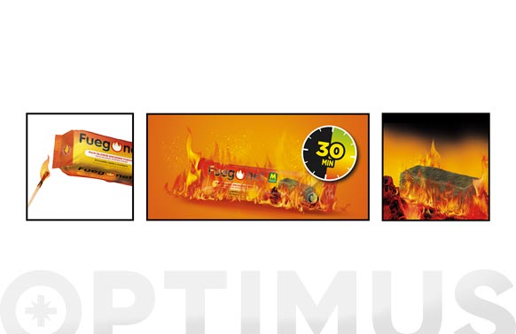 Encendido rápido y ecológico. Ideal para cualquier tipo de chimenea. Duración 30 minutos. No ensucia las manos. Ideal para el encendido de madera húmeda y grandes piezas de leñas. Modo de empleo: coloque el Maxi-bloque con su envoltorio sobre el suelo de la chimenea, estufa de leña, etc y, sin romper ni quitar el papel del Maxi-bloque Fuegonet, enciéndalo por uno de sus laterales. Composición: ceras de parafina y ceras hidrocarbonadas.