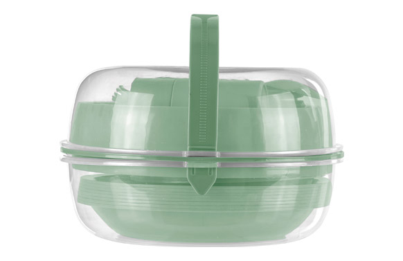 La composición del Set de Camping es: 4 Cucharas, 4 Tenedores, 4 Cuchillos, 1 Cuchara grande, 4 Vasos, 4 Platos grandes, 4 Platos hondos, 4 Platos pequeños, 2 Ensaladeras, 1 Bandeja redonda pequeña